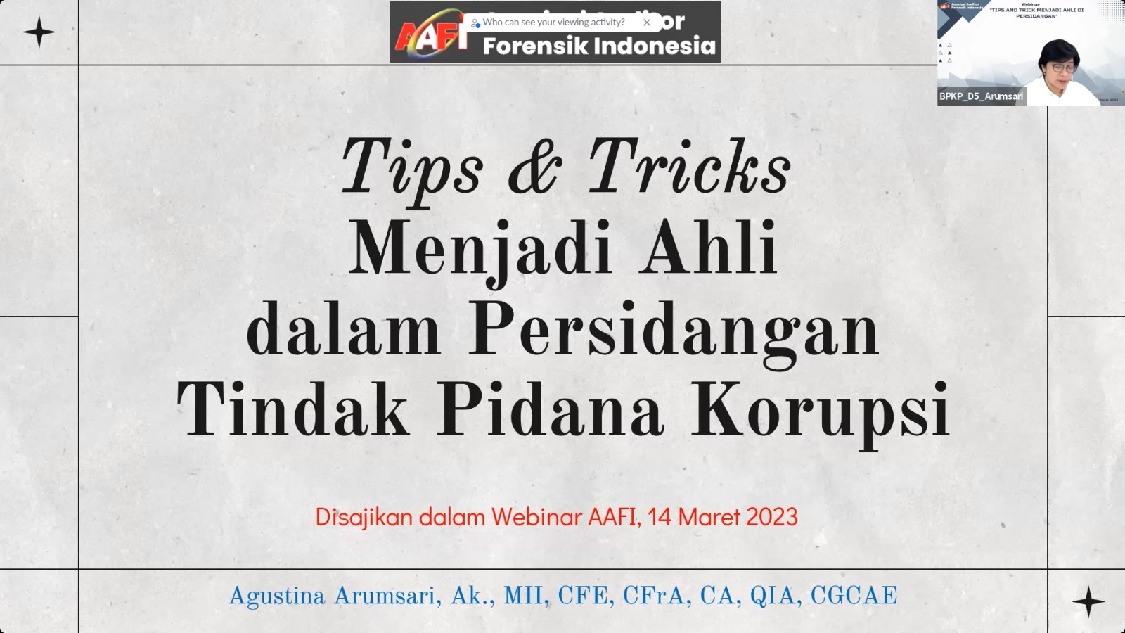 Terkait hal itu, AAFI YUBUMABUR menggelar webinar bertajuk Tips and Tricks Menjadi Ahli di Persidangan yang menghadirkan Ibu Agustina Arumsari, Ak., M.H., CFE, CFrA, CA, QIA, CGCAE (Deputi Investigasi BPKP) sebagai Narasumber dan Ibu Dr. Selvia Vivi Devianti S.E., M.Sc., MCP., Ak, CFrA, CFE, CSFA (Direktur Litbang BPK RI) selaku Moderator.�