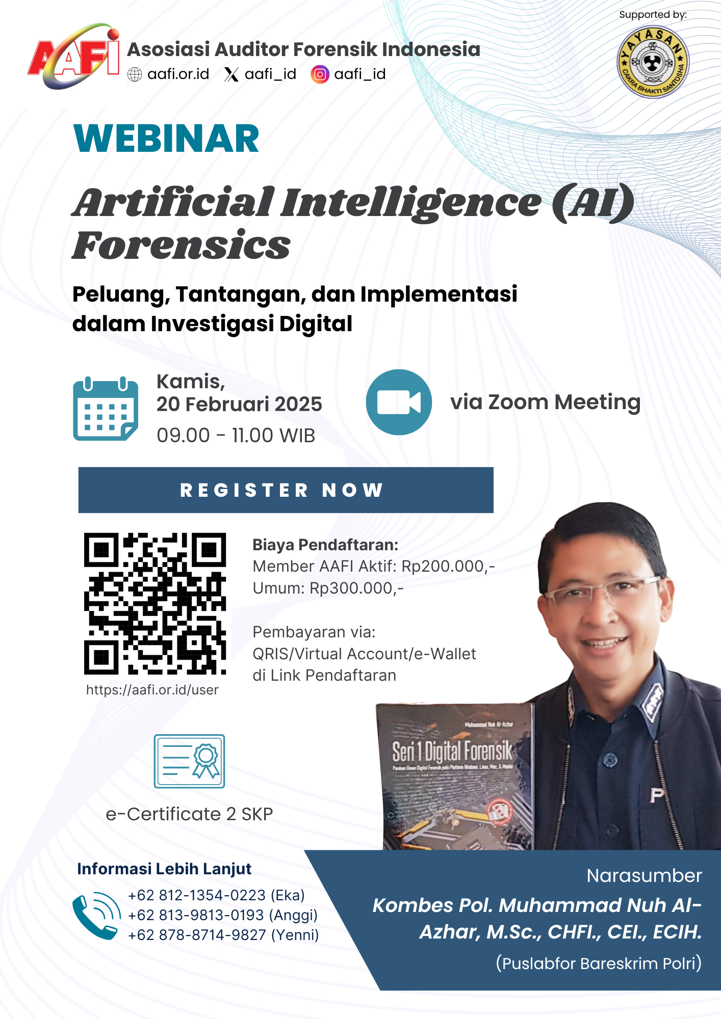 Untuk menjawab pertanyaan-pertanyaan ini, Asosiasi Auditor Forensik Indonesia Yubumabur (AAFI YUBUMABUR), dengan dukungan dari Yayasan Cakra Bhakti Santosha, mengadakan webinar bertema "Artificial Intelligence (AI) Forensics".